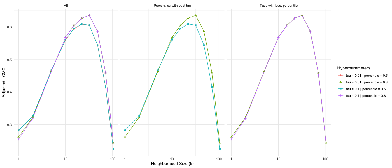 When LoCoMDS is run with multiple choices of hyperparameters, the tune_locoMDS function can be used to select the best consensus embedding based on the adjusted local continuity meta-criterion (LCMC). Higher adjusted LCMC values indicate a better fit. In this case, it appears that on average across the different LCMC neighborhood sizes, percentile = 0.8 yields higher adjusted LCMCs than percentile = 0.5 while the choice of tau does not make any noticeable difference. Given a particular choice of tau and percentile, we can extract the LoCoMDS consensus embedding with these hyperparameters via