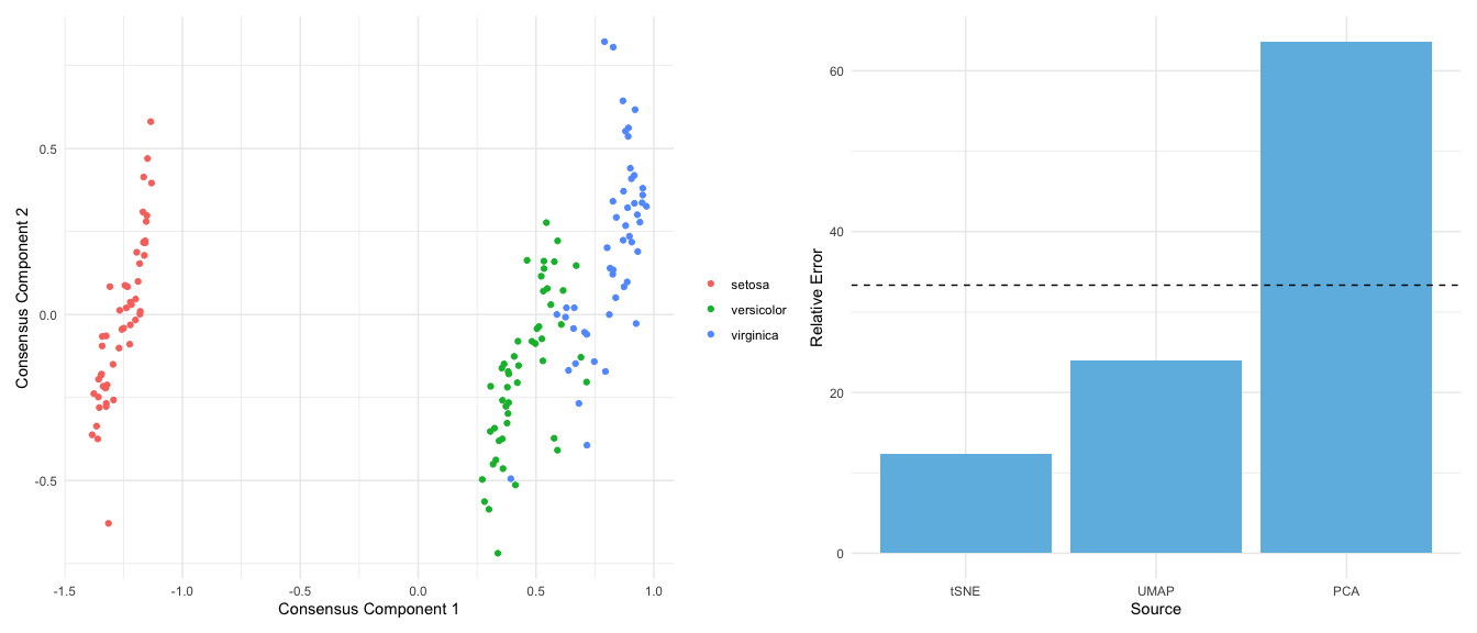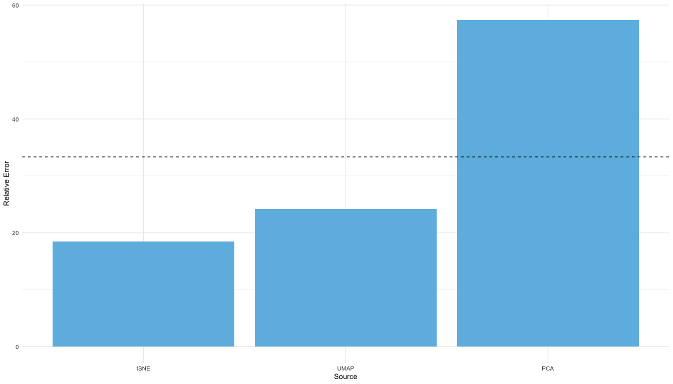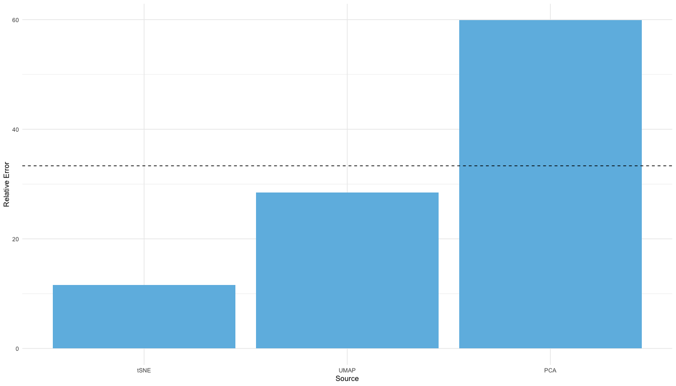 Smaller relative errors indicate that the consensus embedding is more similar to that particular input dimension reduction embedding, relative to the other input dimension reduction embeddings.