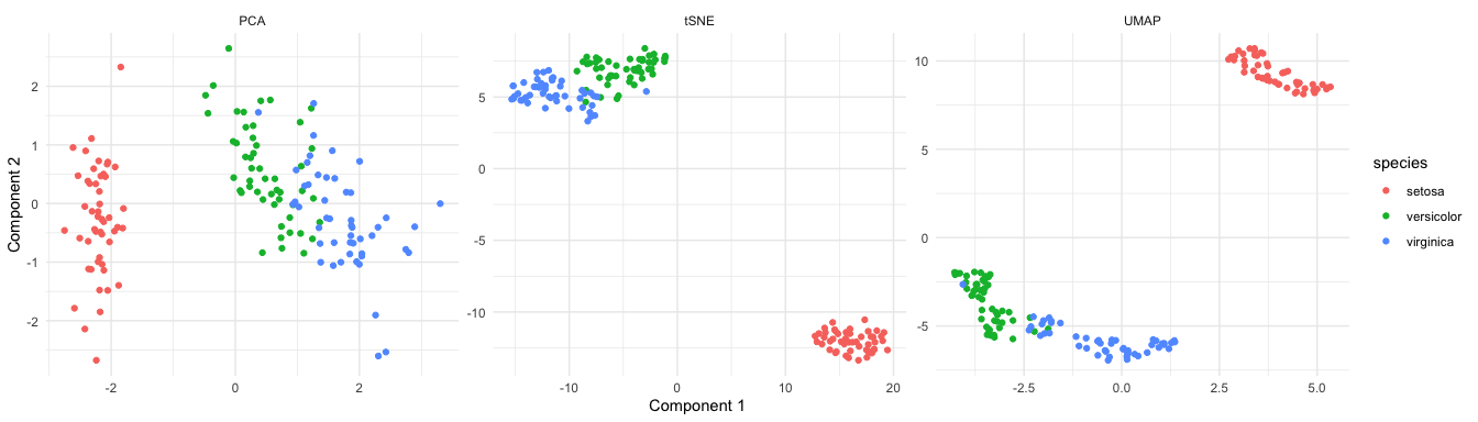In this example, we first applied three different dimension reduction methods (i.e., PCA, t-SNE, and UMAP) to the iris dataset. In many real-world datasets, these dimension reduction methods can yield very different low-dimensional embeddings.