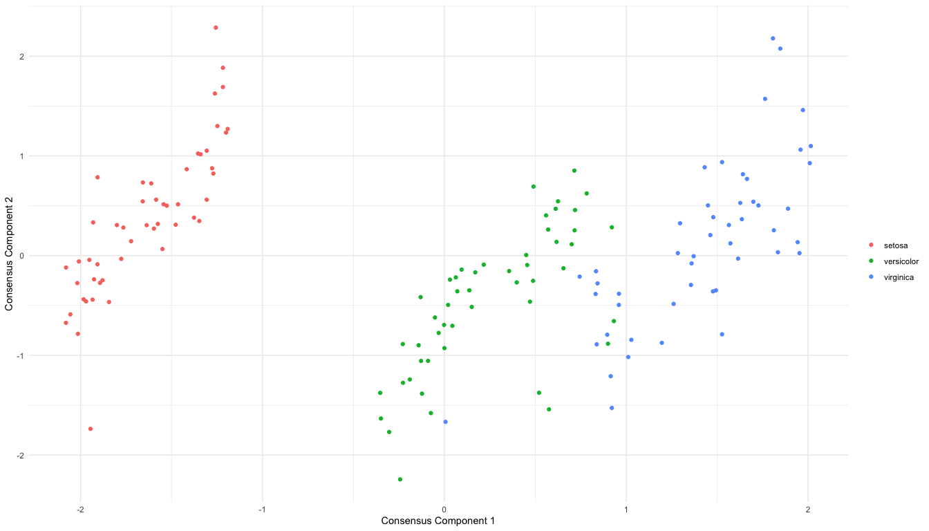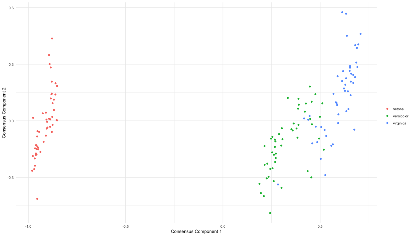 comds_out <- coMDS(embed_list = dr_list, ndim = 2)We can visualize the CoMDS consensus embeddings via